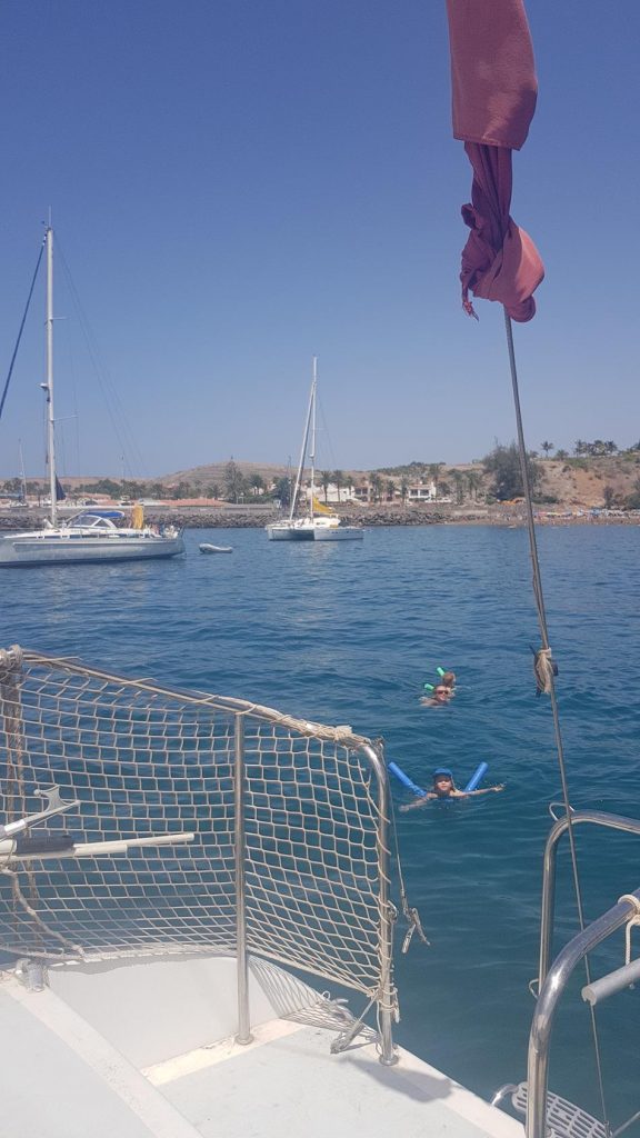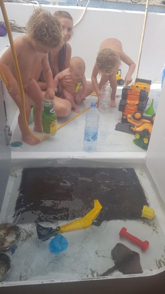 While we were here it was so settled in the anchorage that we didn’t actually visit the beach! Instead we swam around the boat, a lot – 4 times a day was probably an average. Lots of new games are being invented, some of which dog owners would recognise (“fetch the ball Arthur”) others of which might be more commonly seem among chimpanzees (“slide down the anchor bridle, Arthur/Theo”). We are all having lots of fun swimming. I (Dave) particularly enjoyed watching Charlotte, Arthur and Theo swim over to visit “Jacob’s boat” which was anchored nearby – there were a few kid-boats around actually which was nice for the kids. Every time he gets in the water now Theo wants to either swim to another boat or the rocky-area adjacent to where we were anchored.