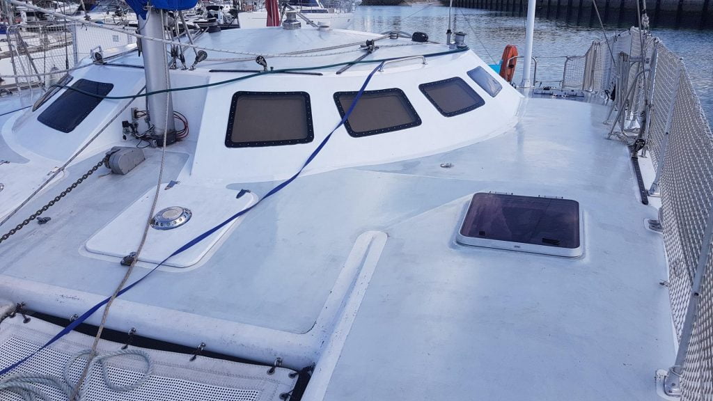 We have set twin headsails up on the jib – using one halyard so they can be furled. Because of our 7m beam, and tracks near the edge of the boat, we can keep both jibs held “out”, one to each side, easily. For downwind sailing this will mean we can easily adjust how much sail we have up (the jib can be rolled away incrementally) – and if hit by a sudden increase in wind speed we can change course a little and pull one jib on top of the other, which would immediately cut the sail area significantly. We’ll try out flying just the jibs or also flying a reefed mainsail. Theo is keen on trying to fly the spinnaker as well, for even more speed, but he doesn’t understand wind shadows – we’ll show him why that wont work.