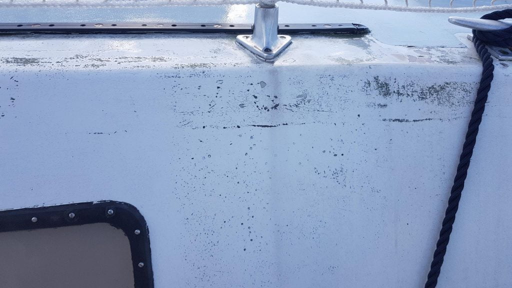The windows were a pain (a few were leaking so even if we were not painting they needed attention) – each one has about 20 screws in, which is about 16 more than they need. But without replacing the windows themselves we had to put them all back in. We’ve used a solid rubber strip as a gasket, tightened them enough so there are no leaks with just that, and will add a Sikaflex lip around the edge as insurance. I should mention that it does rain the Canaries, as we found out when a thunderstorm struck when we had no windows in… there was 3” of water in each of the bilges. Whoops.