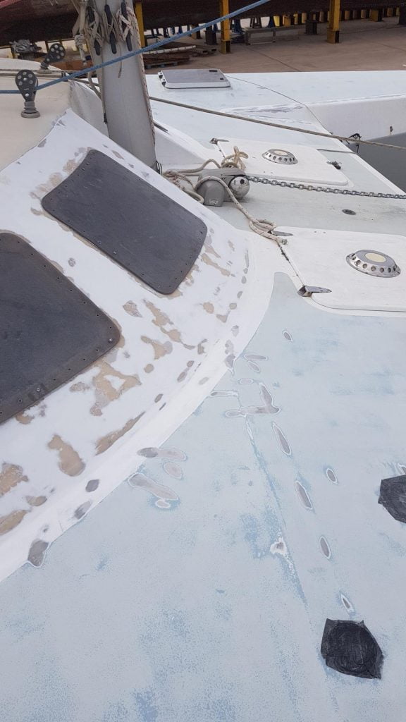 Remove and later re-fit each and every fitting on the boat – properly. We had a couple of minor leaks, which on a cored boat can be very bad news indeed, so we took this opportunity to check EVERYTHING. This involves drilling out a larger hole than needed, filling that with thickened epoxy, drilling a hole the right size, tapping it to accept a threaded machine screw, slathering the bottom of the fitting in sealant and screwing down to leave a gasket of sealant, screwing down, then adding backing plates/washers/nuts.