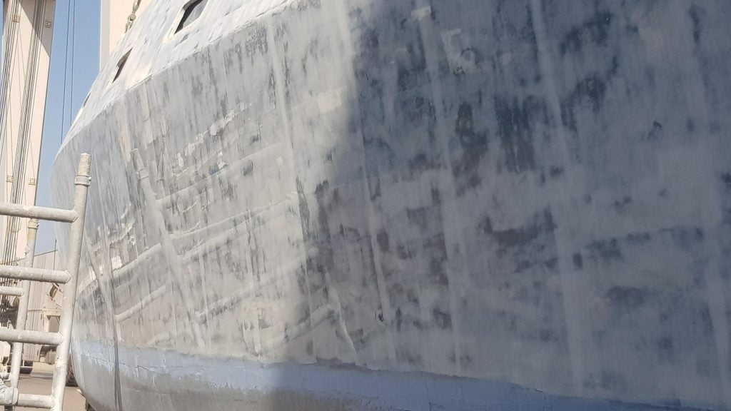• sandblast bottom of boat [after waiting 10 days after an arranged lift out for the sandblaster]