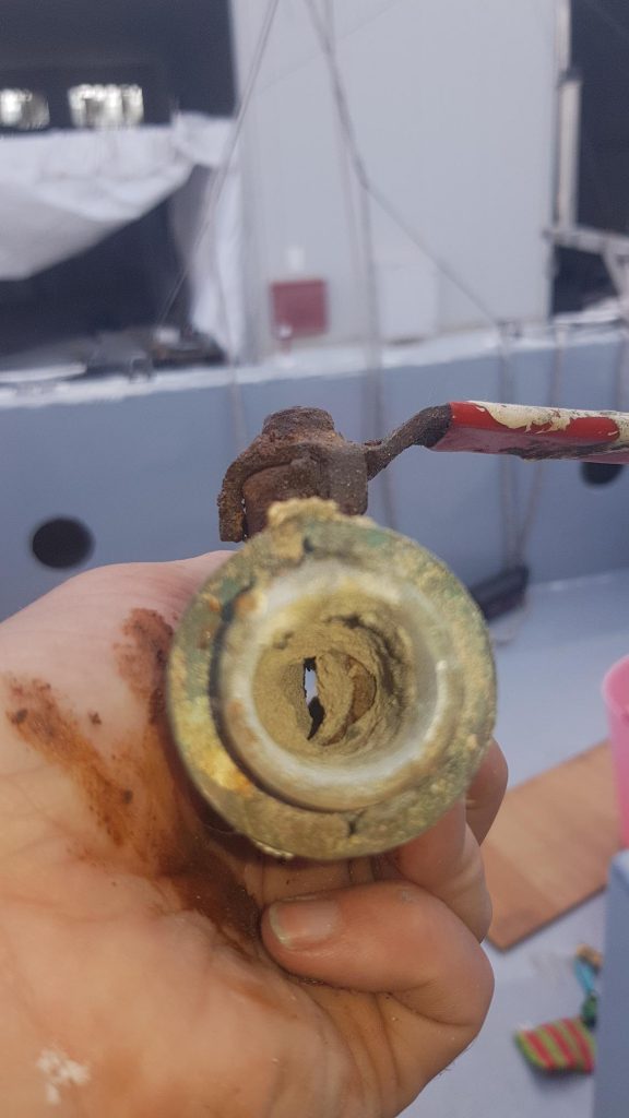 Replace all of the through hulls with Forespar marelon – seacocks below water line, through-hulls above. The corrosion on one of the old “seacocks” – what looks like a domestic ball-valve that was installed below the waterline – was, well, not good… Two redundant through-hulls were filled using fiberglass in concentric circles either side of a core which was glued in place using thickened epoxy. Did some bits of plumbing connected to this.