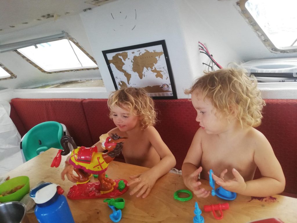 At various points during the day, one of us did our regular checks – for the first few days following a tick-list, after that more informally. These included things like have we cleaned the toilet (seasickness trigger for me), is the fresh food storing OK, have we cleared the cockpit and interior floors of kid detritus before dusk, is there any sign of chafe on the running rigging, has any of the standing rigging moved, are the solar chargers working, is the dinghy still secure, engine checks, is there water in the bilges, how much fresh water do we need to make… the list goes on. Most of those were generally done in a burst of activity when the bigger kids were entertaining themselves with an activity and Hector was settled with one of us.