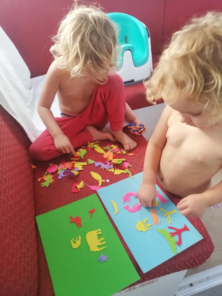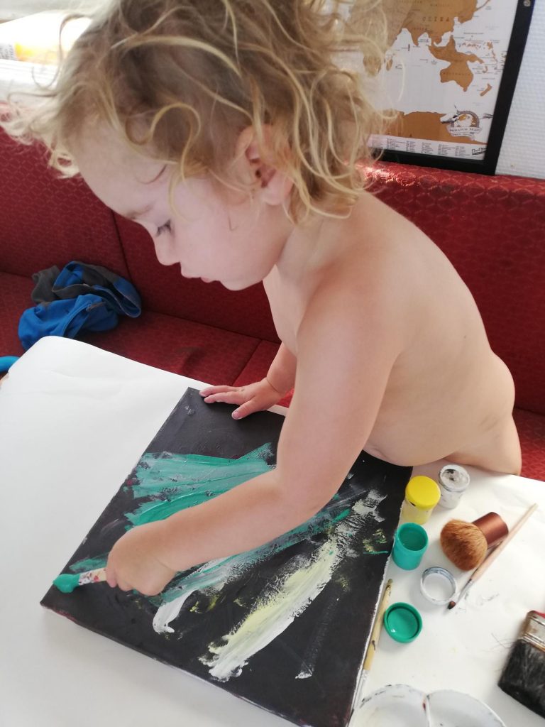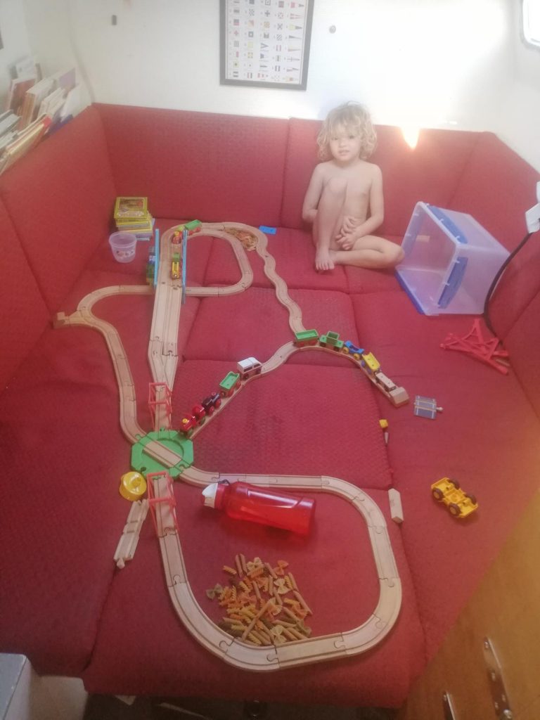 Arthur took to stargazing – he particularly loved shouting “there’s Orion” every night. Once Hector and Theo were asleep he found every excuse to stay awake for a while – sneaky learning (the best kind), elaborate duplo creations, etc. Then, he took a bedtime snack and went out with either me or Charlotte to look at the stars. After a while he’d ask something like “why do stars twinkle” and much sneaky after dinner learning would ensue. Eventually he would admit he was tired and collapse in a heap on the sofa in the saloon which he has claimed as his passage-bed – although he re-joined the family-bed for a couple of nights, too.