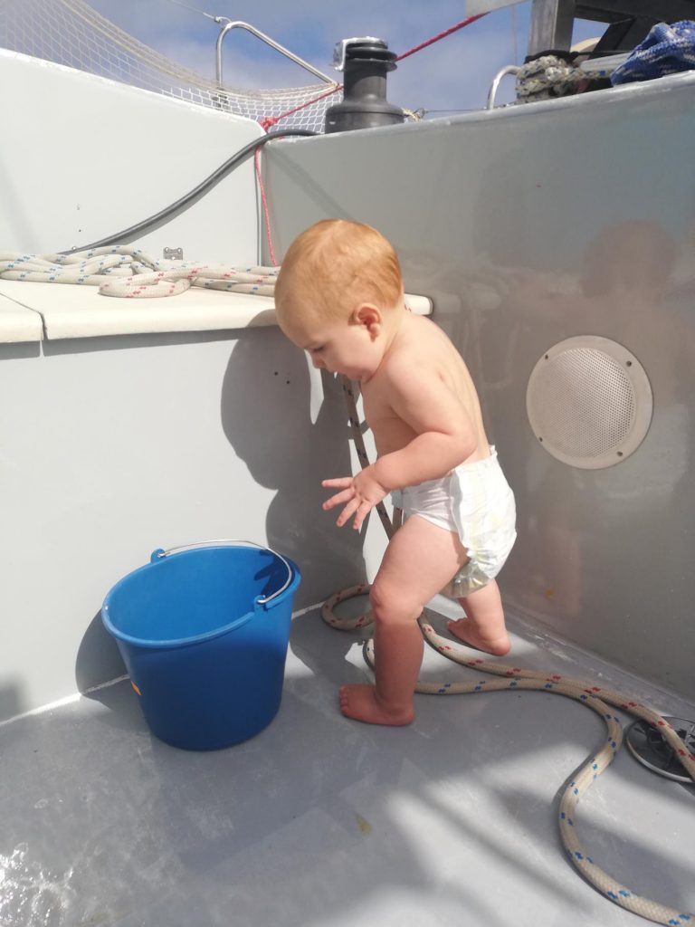 Hector went from standing-and-holding-furniture to full on cruising around the sofas and along the cupboards while we were on passage. He didn’t seem to notice the boat movement at all, which was both a little frightening, and awesome. He’s a boat baby – the one thing guaranteed to make him chuckle even when he is a bit tired is walking him out towards the bow of the boat with the wind blowing at him (the more the better). Loves it.