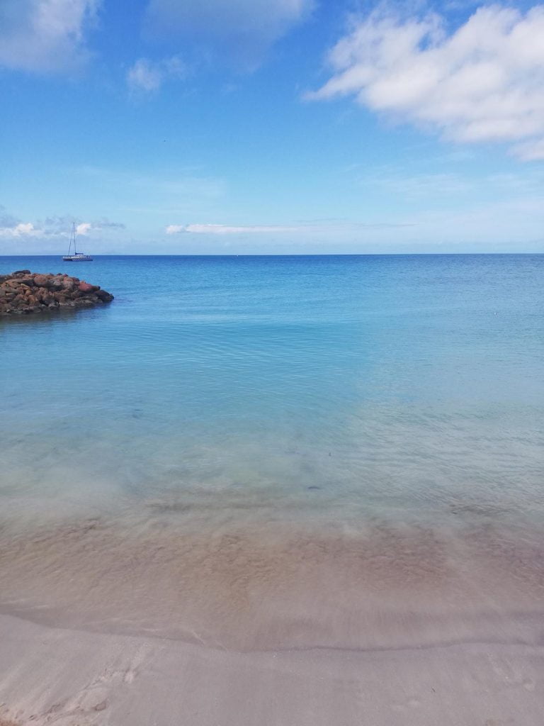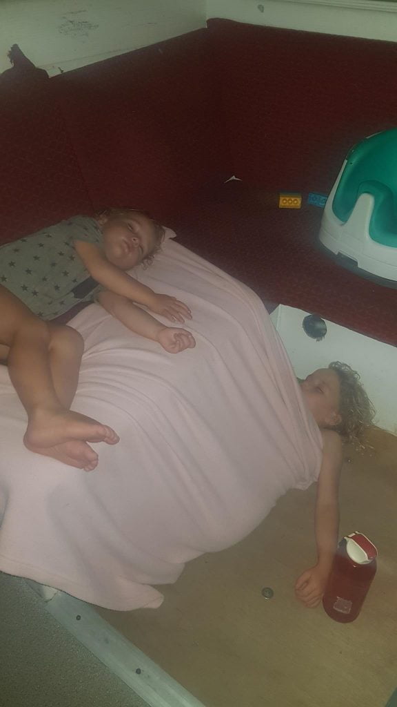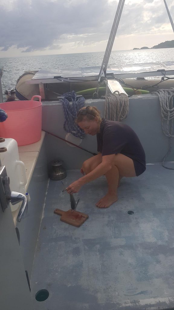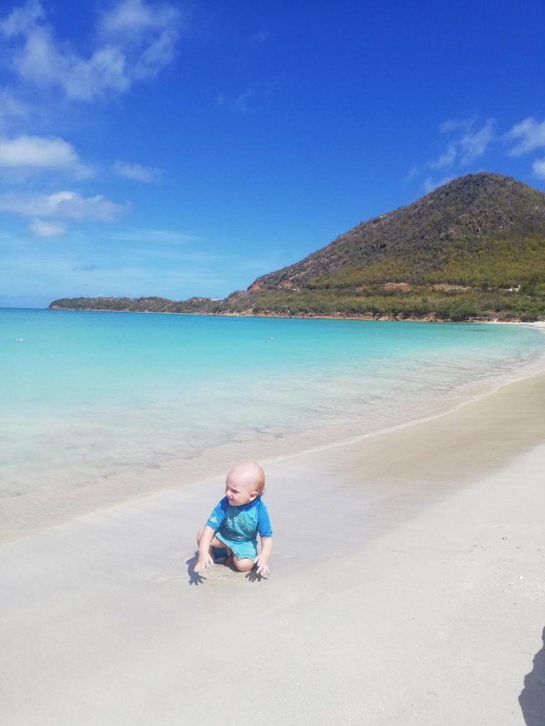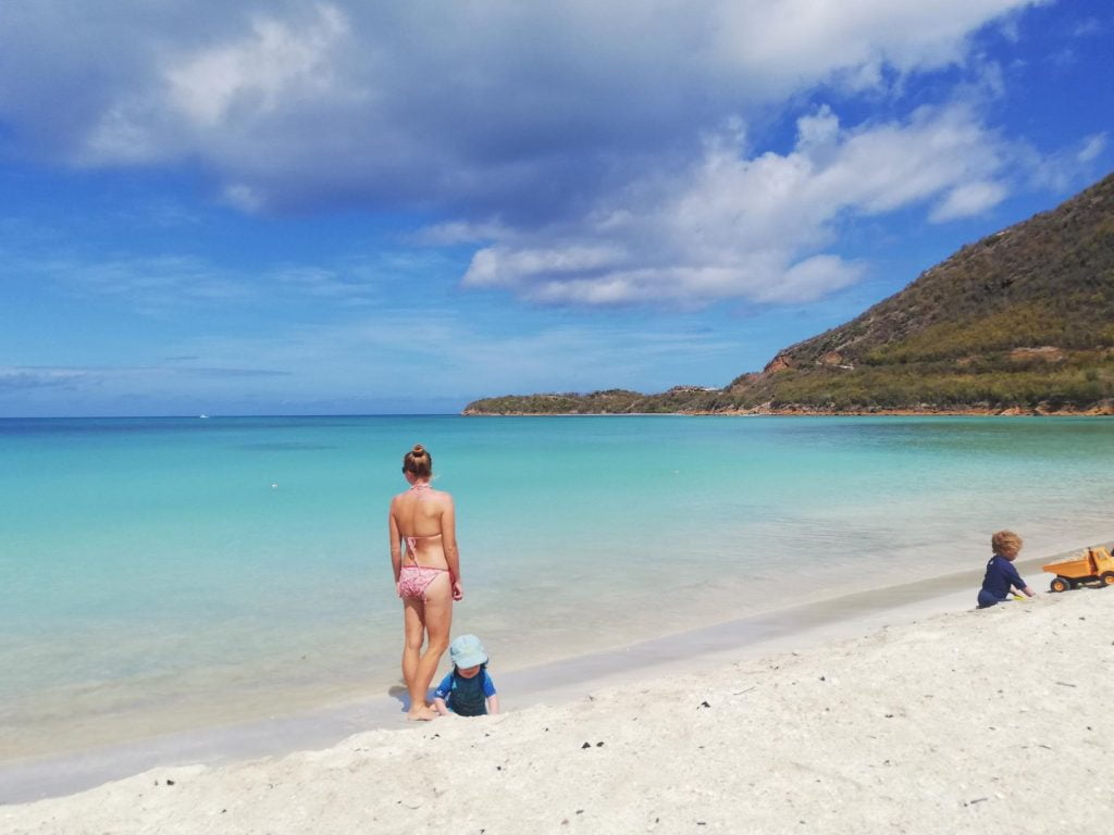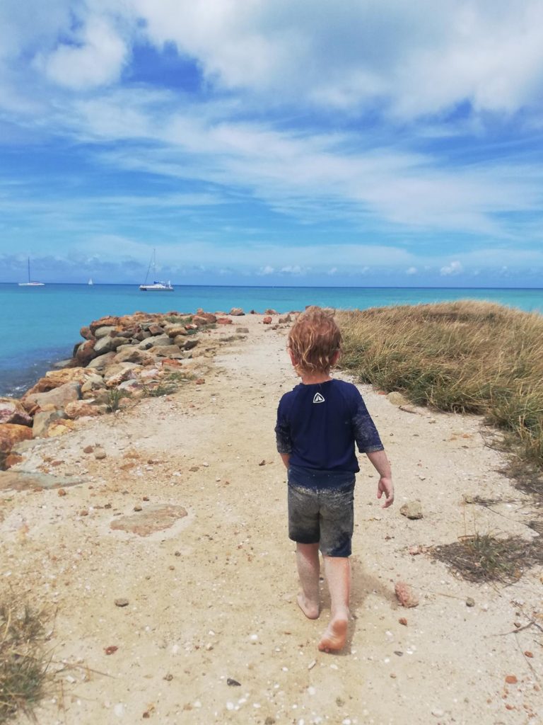Fell through the hatch into kid-zone (about 2m). Cut the back of his head, on a door handle as Arthur-investigator discovered later on (“look, there’s the red of Theo’s blood”). Bled a bit but no problem. Charlotte and I got to catch up on the NICE guidelines for treating a head injury, which is always good – it has been a while. He was fine – obviously a little concussed, but fine. We think he landed on his bum, via smashing into a plate of cookies that was on the side. So we watched him carefully and stayed an extra day at anchor rather than sailing to Barbuda (hospital-less). Cookies were eaten.
