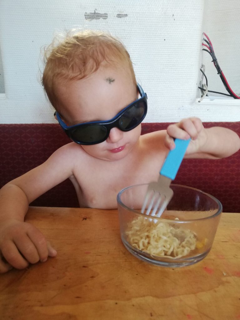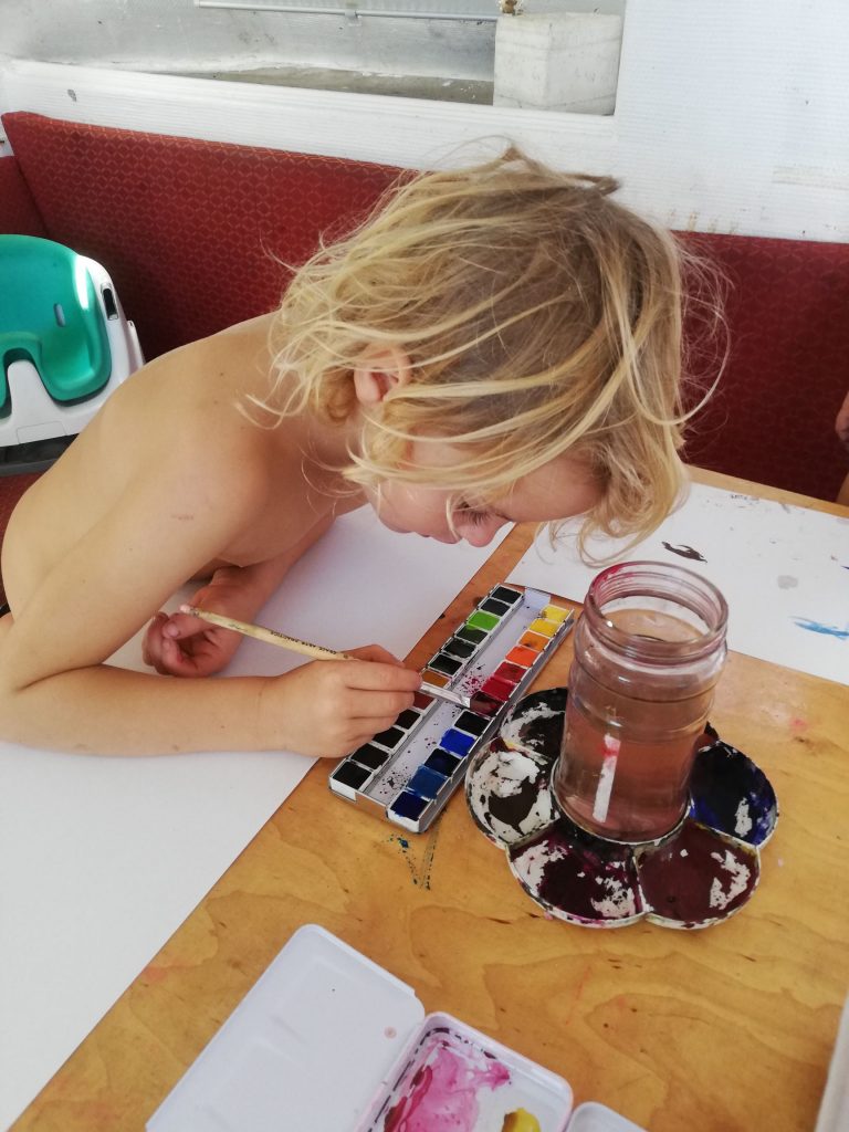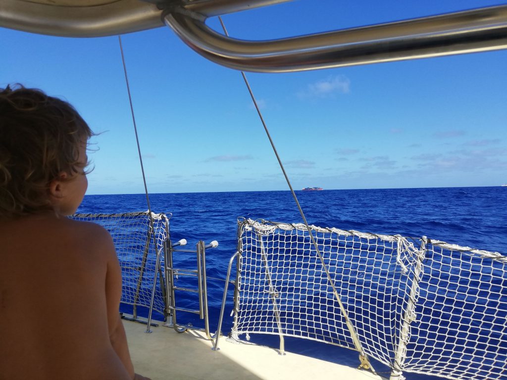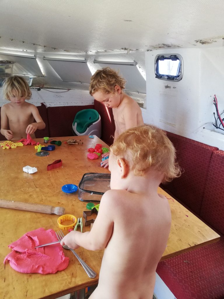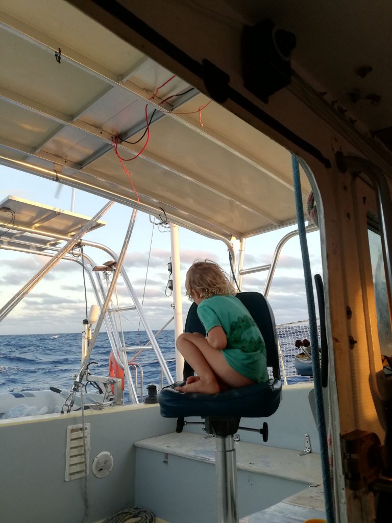 All the way along the kids were painting, playing, and generally acting like it is perfectly normal to not see land. Even though we didn’t plan on making the passage at this time, it worked out very well for us really and was quite nice to be back on a proper passage. Not quite long enough for us to settle into a routine, though, so I was a bit short of sleep despite Charlotte’s best efforts to take the first part of night watch. Arthur decided on the first morning at sea that 4am was a good wake-up time (he then delayed bedtime to 9pm that night, with no hint of a daytime nap), and on the 2nd morning came out to see how watch was going at 3:30am. That time I managed to persuade him that maybe he’d like a little more sleep – on the bench outside so he could see the stars. Loves being at sea at night, that one. As do I.
