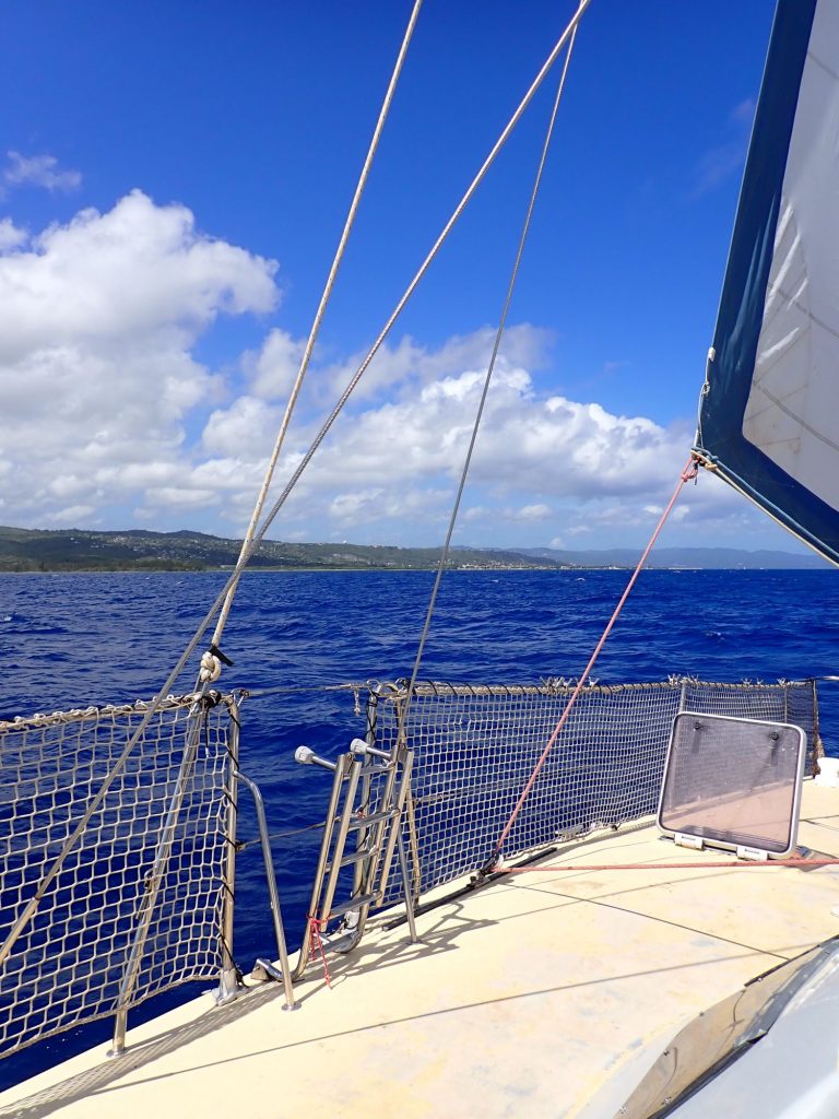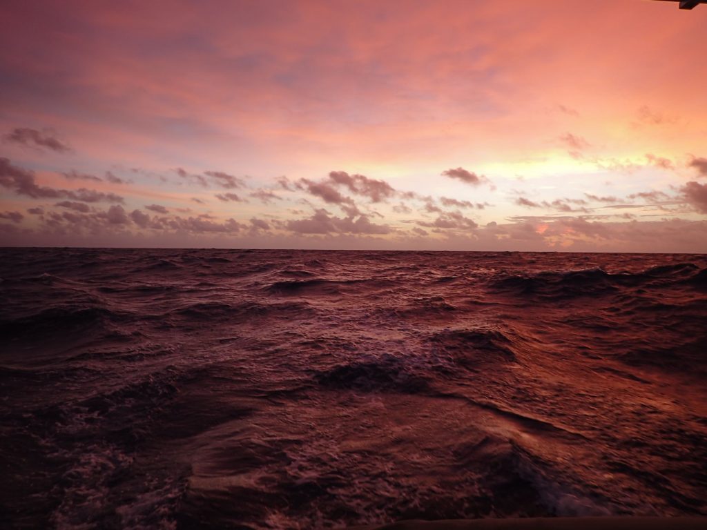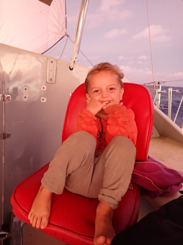 Left around 10. It was actually a lovely sail. The winds and seas were reasonable and we’d become accustomed to the movement by the evening. So while the seas did pick up a bit once we got out of the shelter of the island, with the wind on the beam all that happened is we went faster for a time. No discomfort, lots of “boom” waves for the kids to enjoy. Managed to squeeze in a proper dinner before the waves picked up, too.