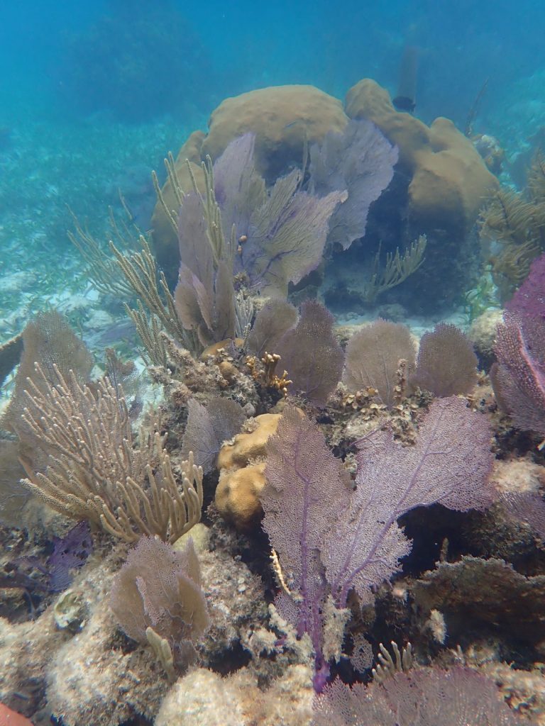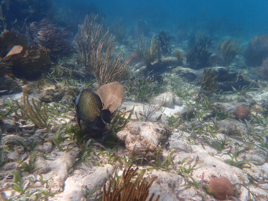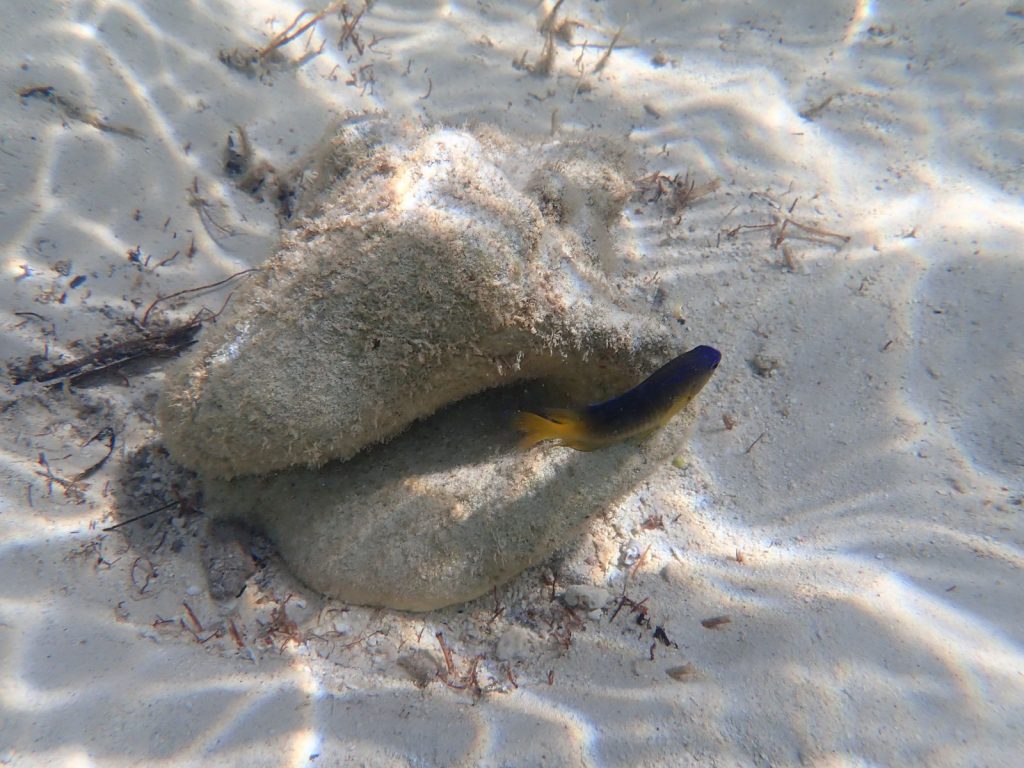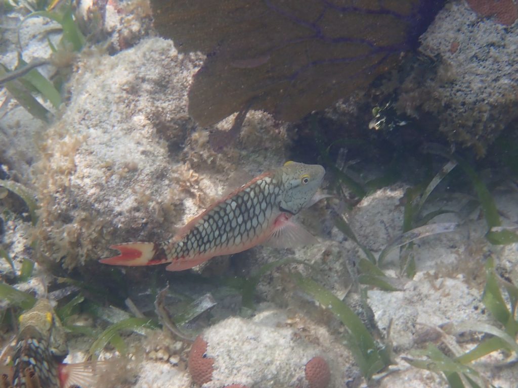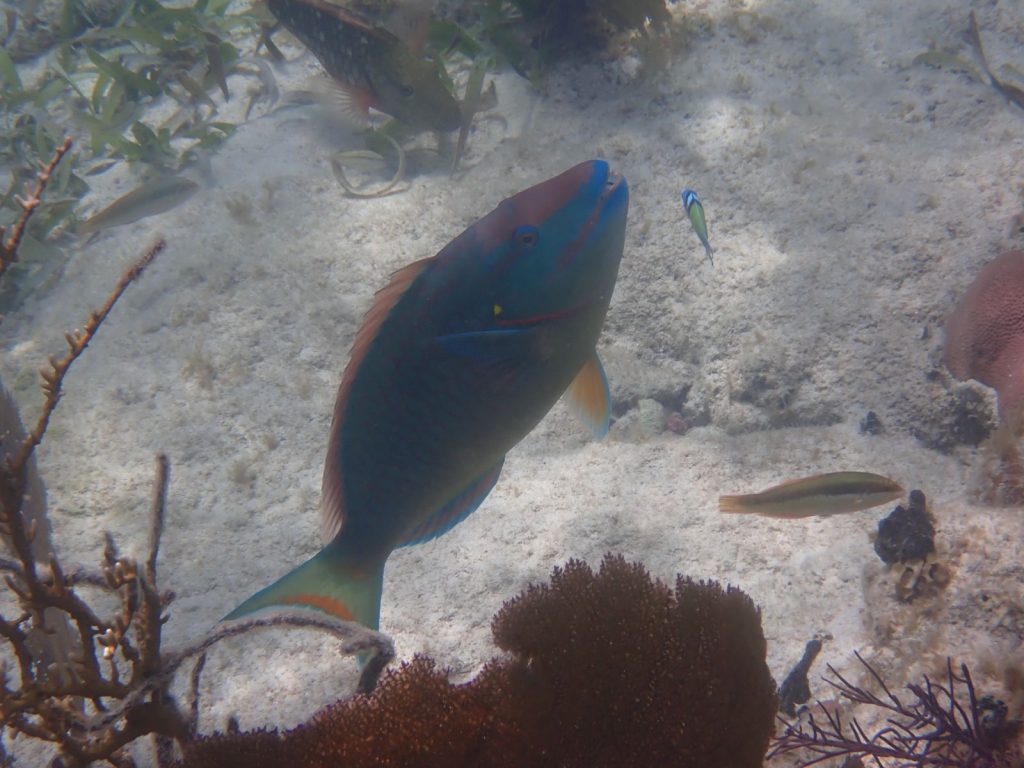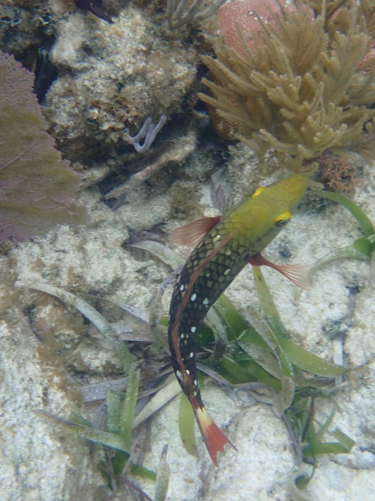 We sped over on the dinghy a couple of times from Hunting Cay, in the mornings while the seas were calm. The snorkeling off the South-West was wonderful, extensive seagrass beds and then, further off, some of the best coral we’d seen to date. “A proper reef” as the kids mentioned. A few dozen times. Arthur was especially happy to see a fish cleaning station- a Spotlight Parrot Fish waiting, head up, to be cleaned nby a Blue-Headed Wrasse. And we saw our first Lionfish, and invasive species here that we could and should spearfish, and some resorts will prepare and cook for you!