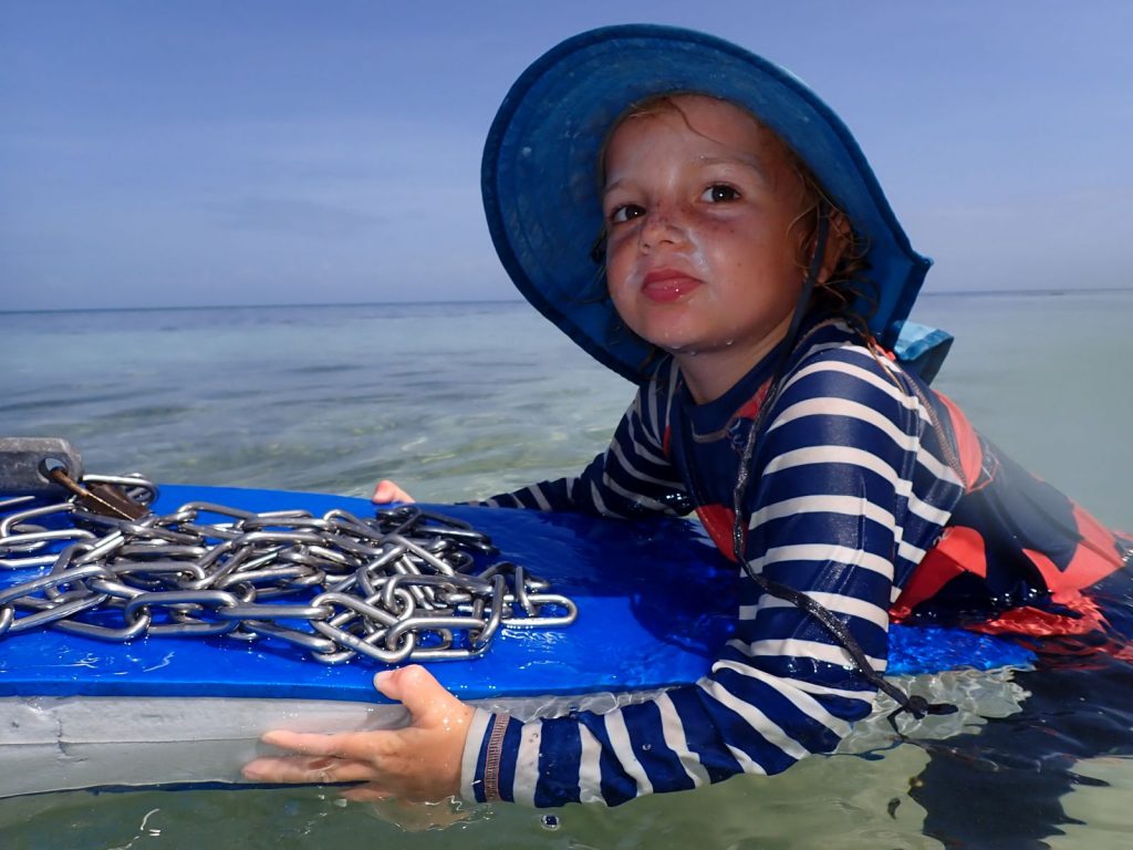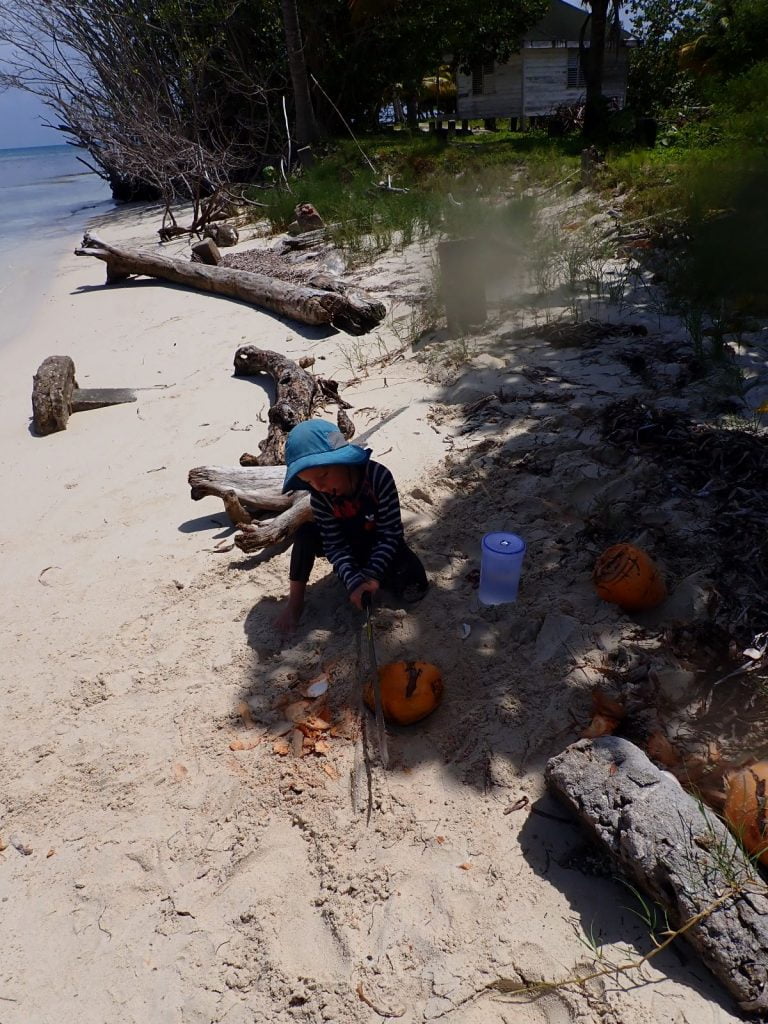 Hector played games with the anchor and chain, often tied to a board fender he claimed was his boat. And had his first attempt to machete open a coconut; not successful, but he had fun and still has all his limbs, so a win.