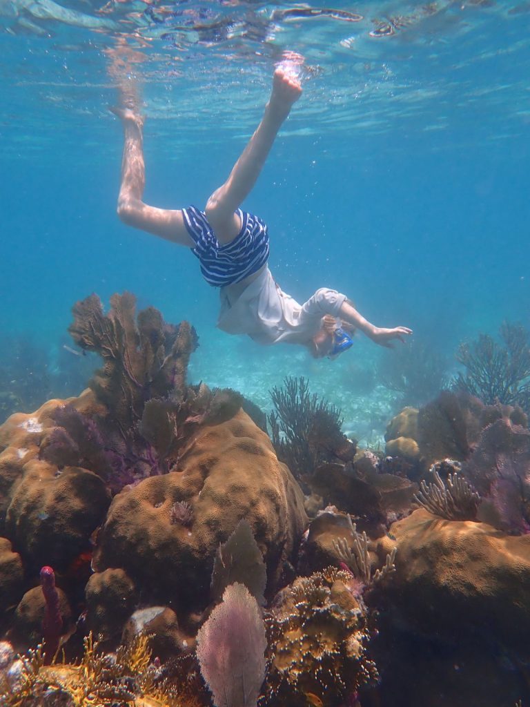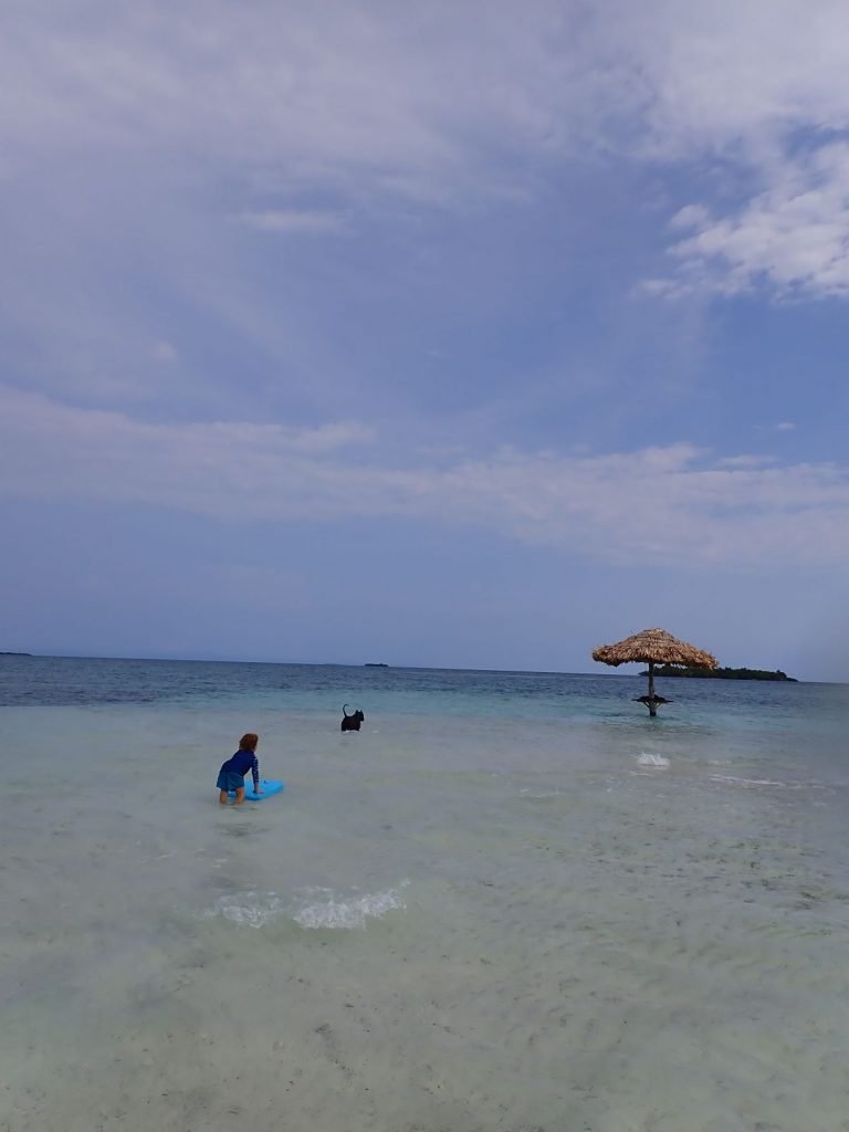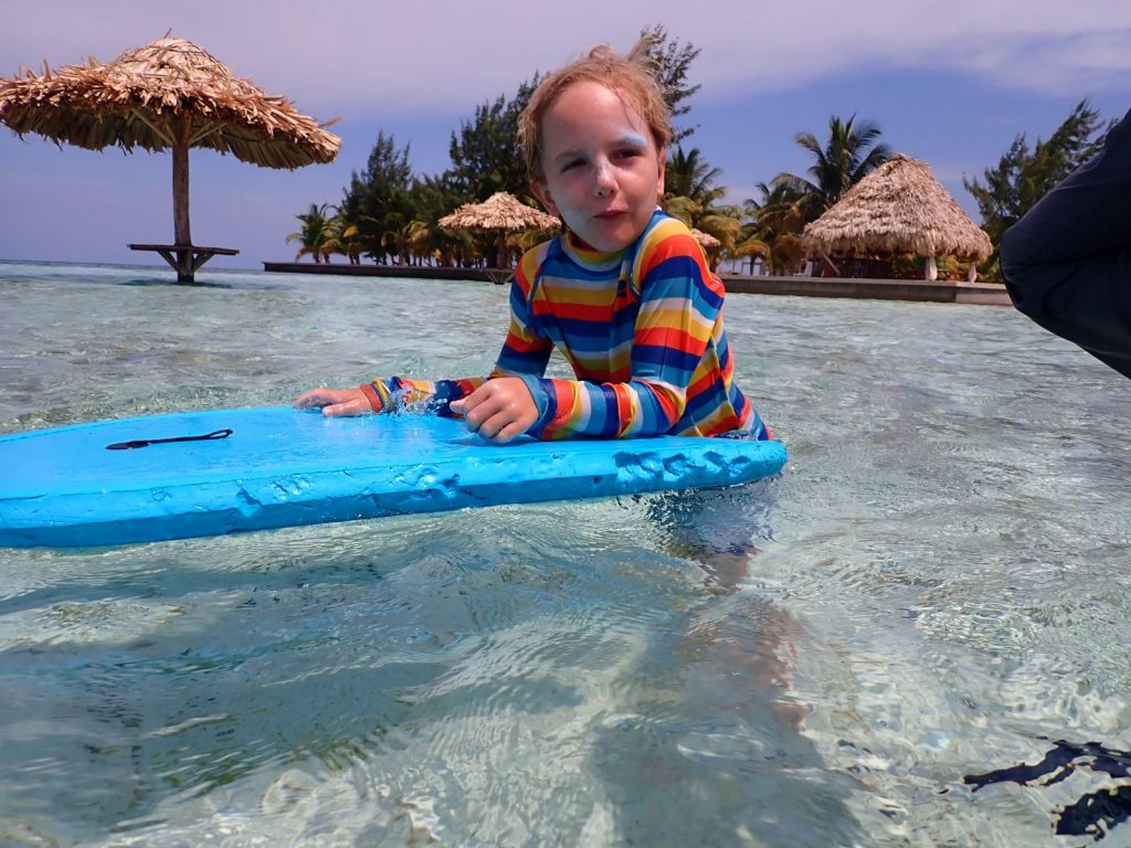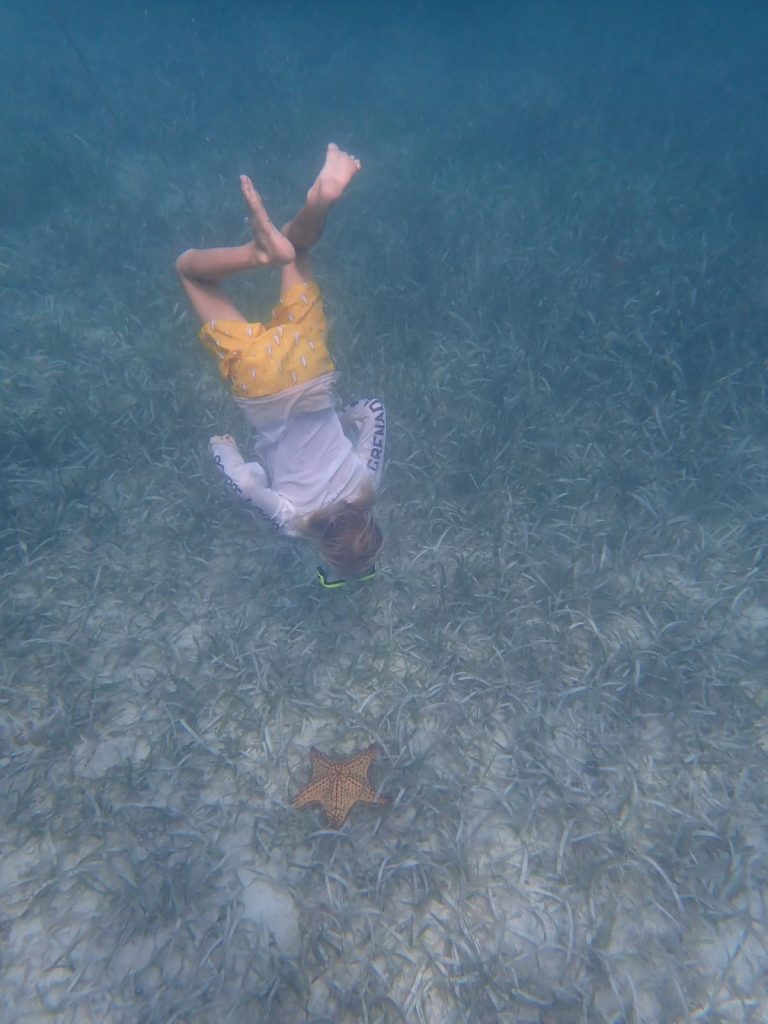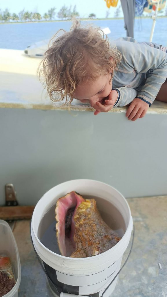 On the way over, Arthur and Theo did the dishes and tidied up, so that we had more time to snorkel when we arrived. That proved to be a good decision. Within half an hour Charlotte and Arthur were swimming with an Eagle Ray. Soon after, we went to see the colorful and lively coral reef on the edge of a 30m drop off. Hector and a parent (we swapped) spent some time on the beach, mostly digging or pushing the paddleboard around in the shallows. Theo mostly snorkeled – he’s really enjoying the clear water and large number of fish species to identify. Arthur, after a chat with the caretaker Edison, went off collecting conch and then fishing on his paddleboard, showing some excellent balance skills. He caught a jack, after paddling far enough out to sea that I wandered towards the dinghy in case he needed rescue. (He didn’t.)