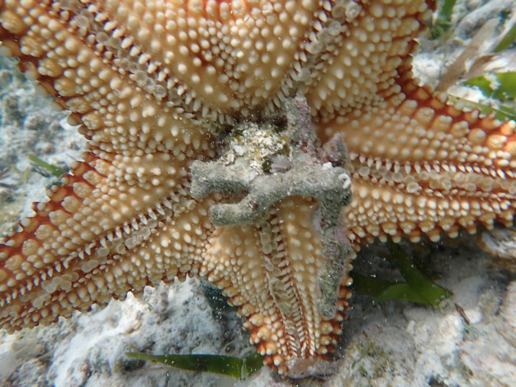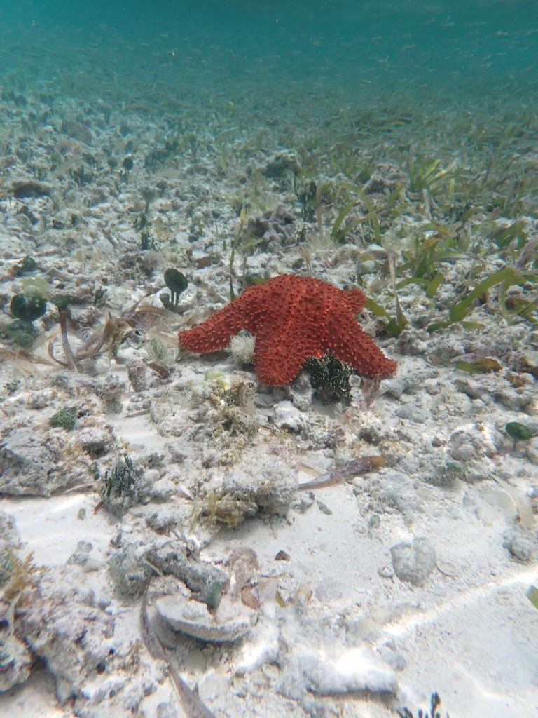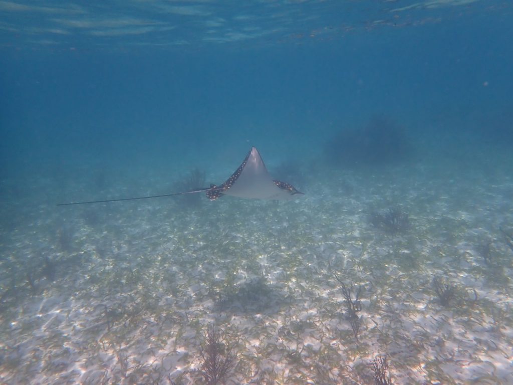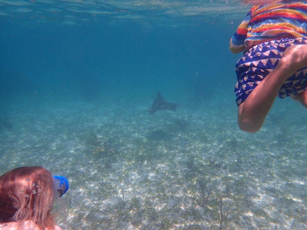 On the way over, Arthur and Theo did the dishes and tidied up, so that we had more time to snorkel when we arrived. That proved to be a good decision. Within half an hour Charlotte and Arthur were swimming with an Eagle Ray. Soon after, we went to see the colorful and lively coral reef on the edge of a 30m drop off. Hector and a parent (we swapped) spent some time on the beach, mostly digging or pushing the paddleboard around in the shallows. Theo mostly snorkeled – he’s really enjoying the clear water and large number of fish species to identify. Arthur, after a chat with the caretaker Edison, went off collecting conch and then fishing on his paddleboard, showing some excellent balance skills. He caught a jack, after paddling far enough out to sea that I wandered towards the dinghy in case he needed rescue. (He didn’t.)