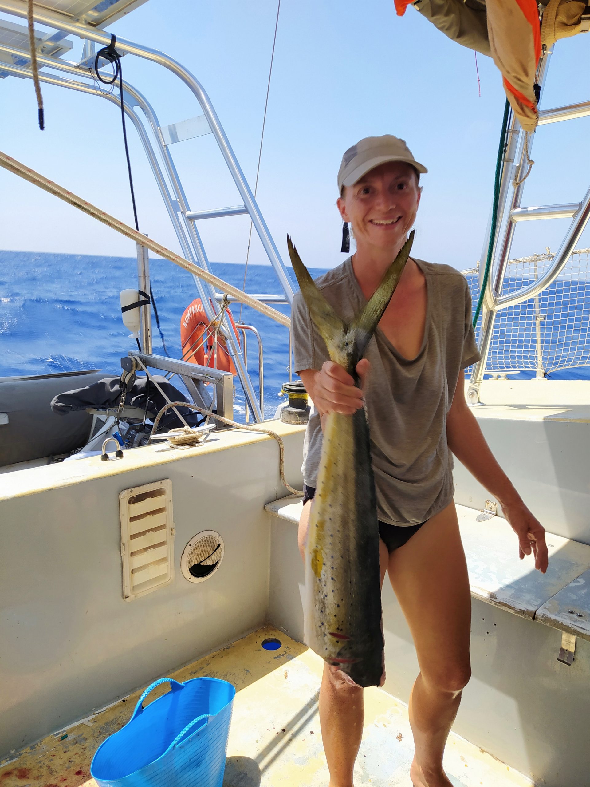 Slow but wonderful sail for our first passage in a year! Caught a Mahi Mahi (yum), and saw a whale breaching repeatedly on the way out of Samana. Great trip.